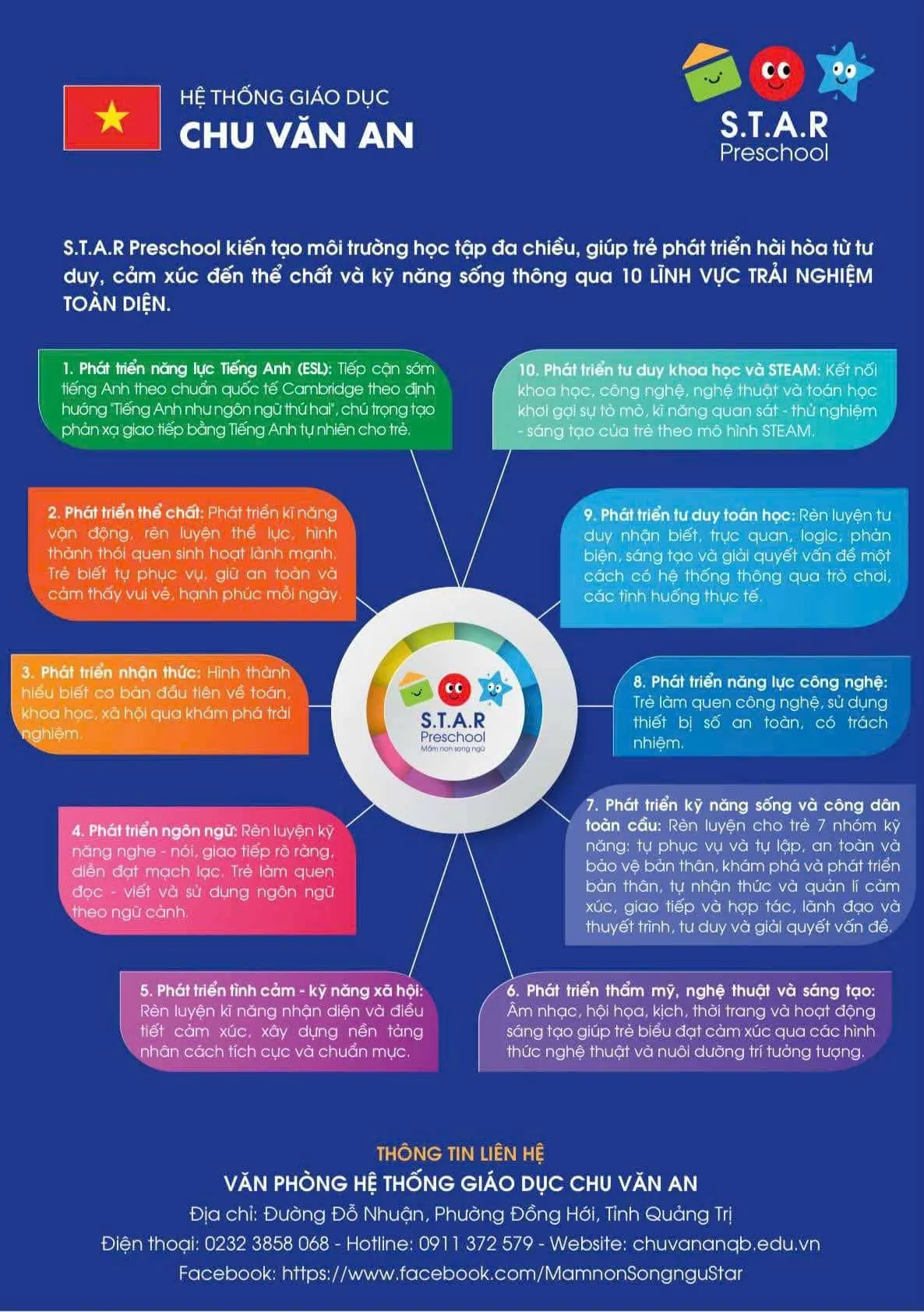 S.T.A.R Preschool là điểm khởi đầu trong hành trình giáo dục liên cấp của Hệ thống giáo dục Chu Văn An. S.T.A.R Preschool hướng đến mục tiêu trở thành trường mầm non chất lượng cao hàng đầu tại khu vực miền Trung và Việt Nam - tiên phong về chương trình tích hợp Quốc tế, đặt nền tảng giáo dục thế hệ công dân toàn cầu có trí tuệ, nhân cách và bản sắc Việt.