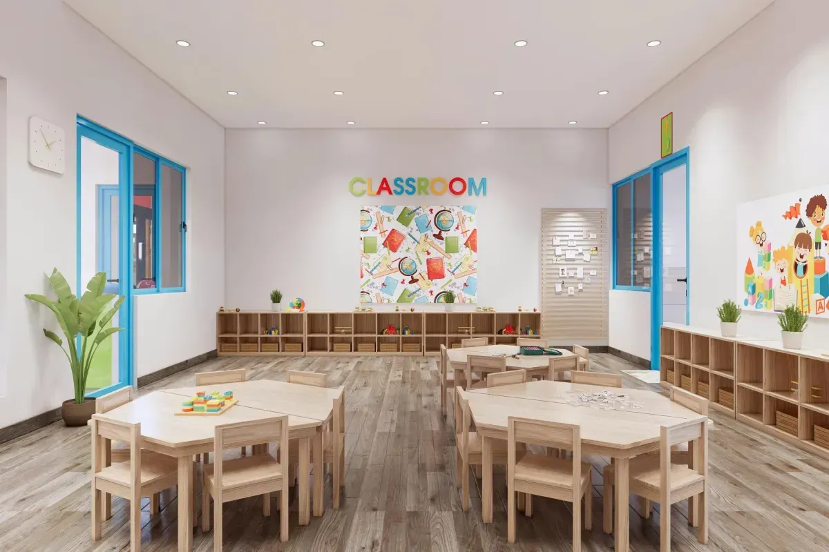 Phòng học thiết kế mở, thân thiện với trẻ nhỏ, hệ thống điều hòa 2 chiều, sàn gỗ hiện đại, khu vệ sinh nam/nữ riêng từng lớp.