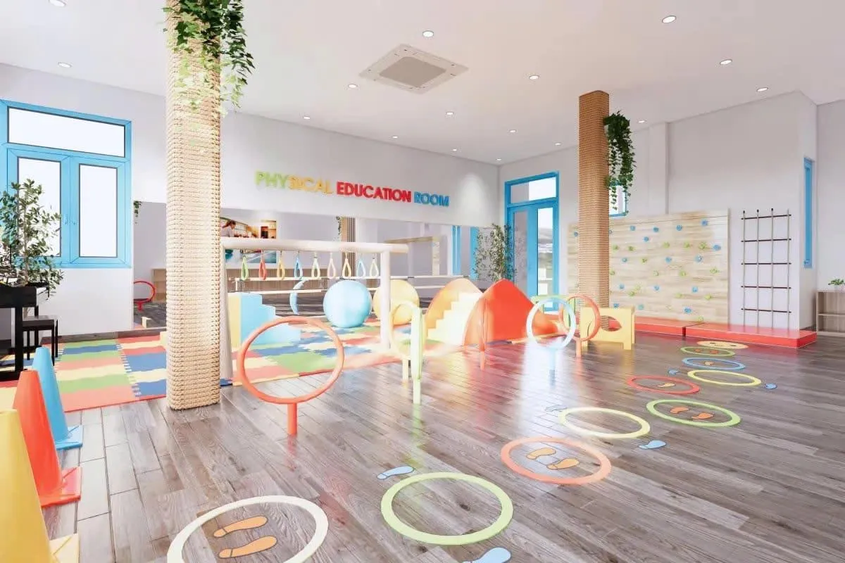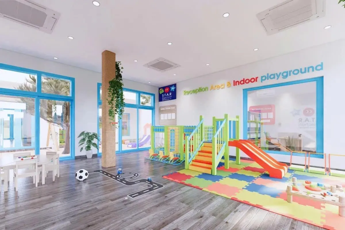 Hệ thống phòng chức năng và các khu hỗ trợ đồng bộ, tiện nghi: Bể bơi, nhà đa năng, sân bóng đá, vườn sinh học, khu vận động ngoài trời, khu vận động trong nhà, thư viện, xưởng nghệ thuật, phòng thể chất, phòng Tiếng Anh, phòng STEAM.