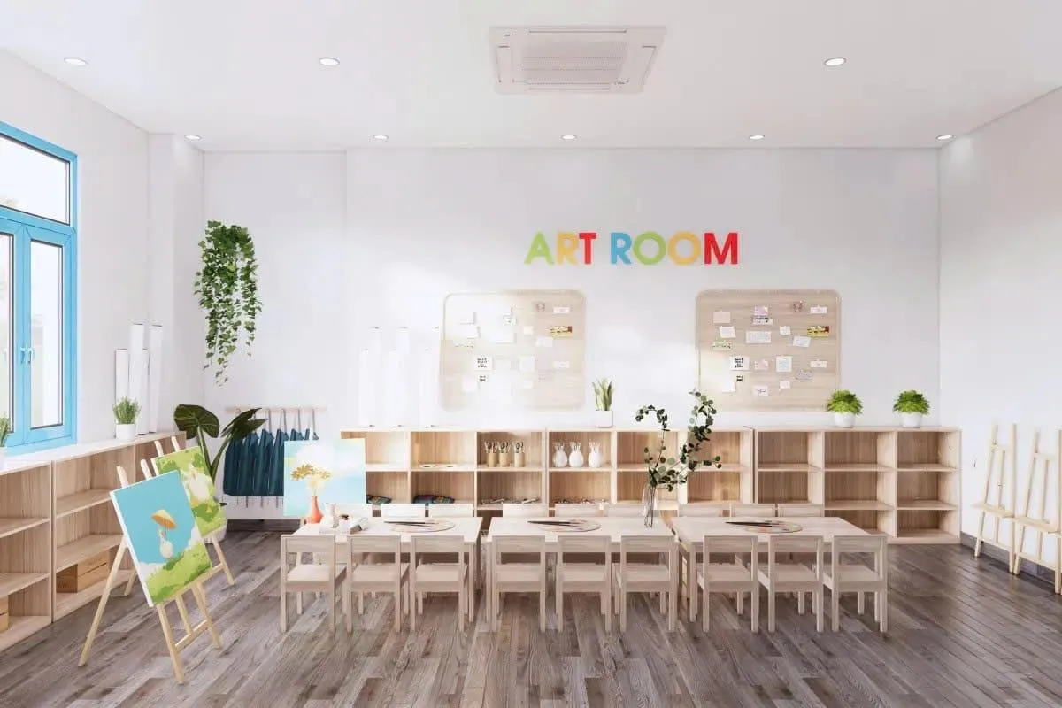 Phòng học thiết kế mở, thân thiện với trẻ nhỏ, hệ thống điều hòa 2 chiều, sàn gỗ hiện đại, khu vệ sinh nam/nữ riêng từng lớp.
